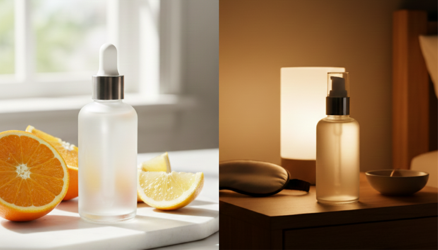 En este esquema, la Vitamina C protege durante el día y el retinol renueva durante la noche. Alternarlos evita irritación y potencia los resultados sin saturar la piel.