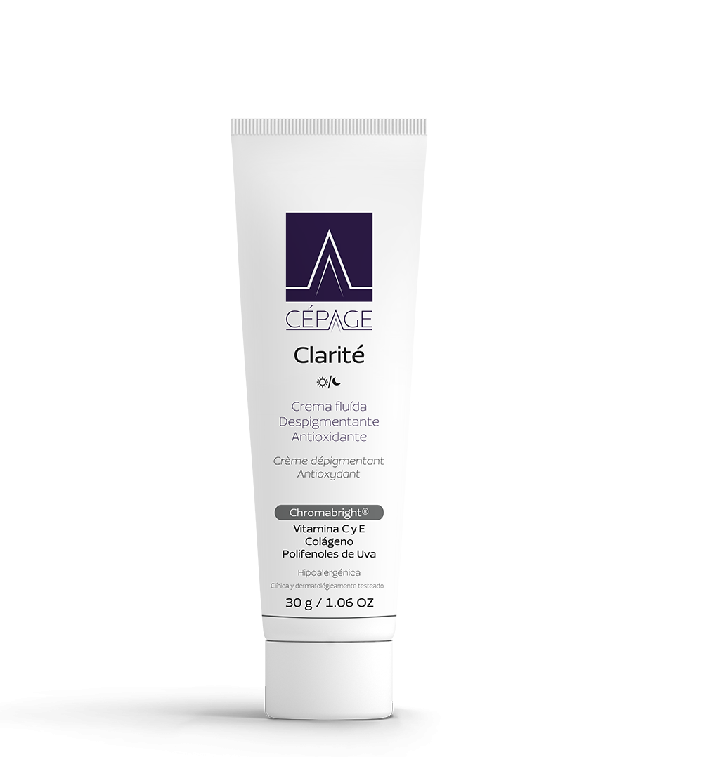 Clarité es una fórmula específica despigmentante. Ideal para manchas cutáneas propias de la edad o bien las causadas por factores medioambientales o genéticos. Su fórmula contiene activos innovadores, exclusivos y sinérgicos: Chromabright®, activo blanqueador que regula el proceso de pigmentación de la piel mediante la reducción de la actividad de la tirosinasa; una enzima clave que cataliza las dos primeras reacciones de la síntesis de melanina, responsable del color de la piel. Unifica visiblemente y de forma segura la piel al tiempo que retrasa el fotoenvejecimiento. No fotosensibilizante. Apto para usar todo el año. Posee además un alto efecto antioxidante gracias a nuestros exclusivos Polifenoles de UVA combinados con nanoesferas de Vitamina C y Vitamina E. Esta asociación potencia la acción despigmentante de Chromabright®. Su textuta fluída y de rápida absorción aporta hidratación y luminosidad.
