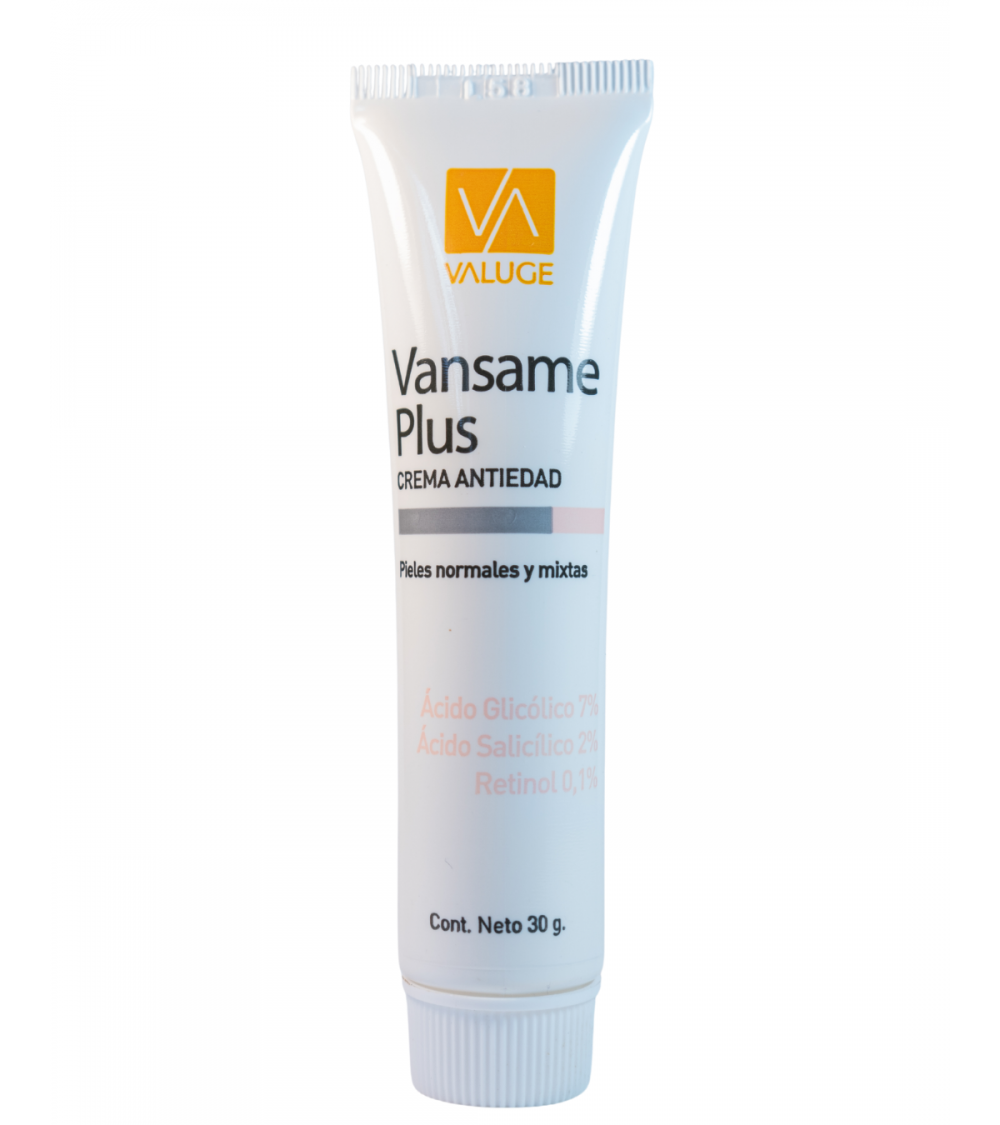 PROPIEDADES: VANSAME PLUS es una crema especialmente formulada para el tratamiento de la piel envejecida y con tendencia al acné. La opacidad, rugosidad, presencia de arrugas y manchas que caracterizan a la piel envejecida o dañada por el sol, mejoran con el uso continuo de VANSAME PLUS. VANSAME PLUS contiene ácido glicólico, ácido salicílico y retinol. El ácido glicólico es un alfa hidroxiácido (AHA) que induce una exfoliación leve de las células muertas de las capas superficiales de la piel al disolver el cemento que mantiene unidas estas células. Además aumenta el recambio de las células de la piel. También aumenta el contenido de agua y el espesor de la piel. El ácido salicílico es un betahidroxiácido (BHA) que actúa principalmente en las capas más superficiales de la piel y en los poros. Es un exfoliante suave que destruye los comedones o los puntos negros, y evita su formación. Estos efectos se traducen en una mayor suavidad y limpieza en la piel. Favorecen la piel con tendencia a la grasitud o las pieles acnéicas. El retinol es una forma de vitamina A. La vitamina A es conocida por su facilidad para penetrar la piel y reparar tanto las capas superficiales como profundas de la piel, estimulando la síntesis de colágeno y elastina. Brinda firmeza, turgencia y suavidad a la piel. Además aumenta el recambio de las células de la epidermis permitiendo el desprendimiento de las células muertas. La piel se verá más suave y lisa, los poros aparecerán más pequeños y menos evidentes. El tono de la piel será más claro y luminoso, disminuyendo la pigmentación moteada. Aumenta los niveles de hidratación. VANSAME PLUS es una crema/emulsión de fácil absorción que no deja residuos. VANSAME PLUS restaura la piel y proporciona una mayor luminosidad y suavidad, disminuyendo las arrugas finas o retardando su aparición. Brinda un grado óptimo de hidratación y mejora la elasticidad. Limpia la piel de impurezas y comedones.
